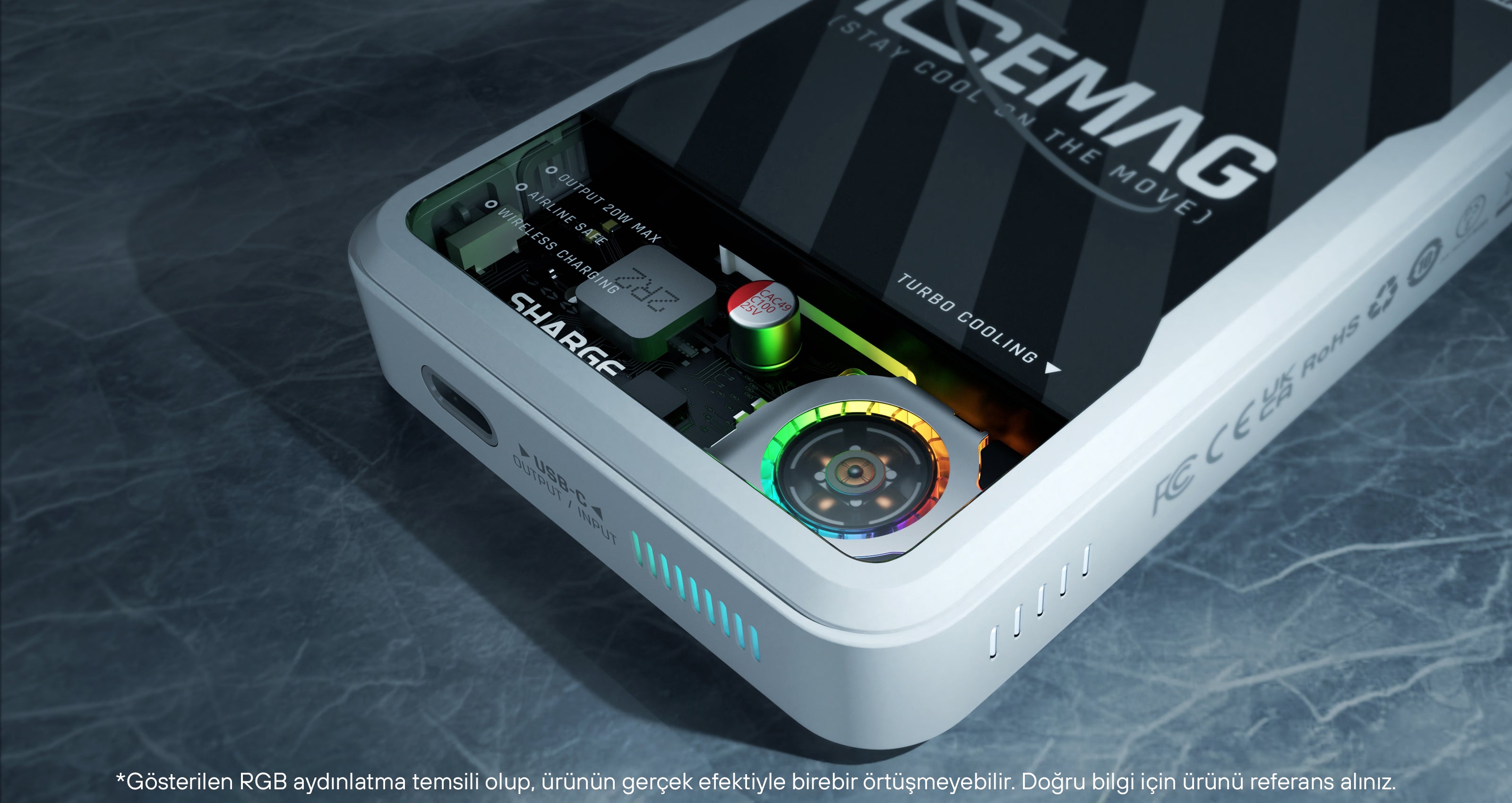 ICEMAG, dünyanın aktif soğutmalı ilk manyetik powerbank’i. 10.000mAh kapasite, 20W hızlı şarj ve RGB aydınlatmasıyla iPhone için benzersiz bir deneyim.